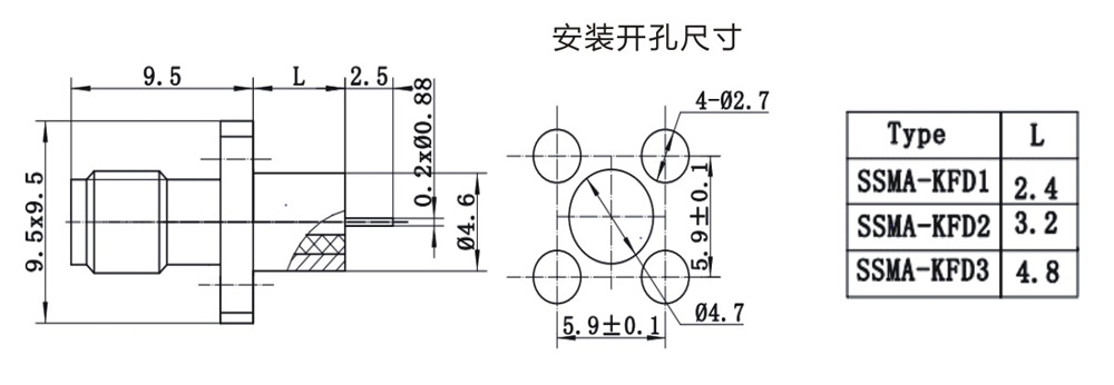 SSMA射频同轴连接器的外形及结构特点类似SMA系列的设计。具有螺纹连接机构,其外导体内径只有2.23mm,工作频率可达40GHz,可供毫米波领域电子设备和仪器的射频回路中选用。我公司生产的SSMA系列产品均符合IEC169-1IEC169-18标准。
